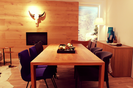 Die Kombination von modernen Möbeln und der Gemütlichkeit eines Alpen-Chalets zeigt diese elegante Wohnsituation mit massiver Eichenholzwand, Kaminfeuer und Naturfell.